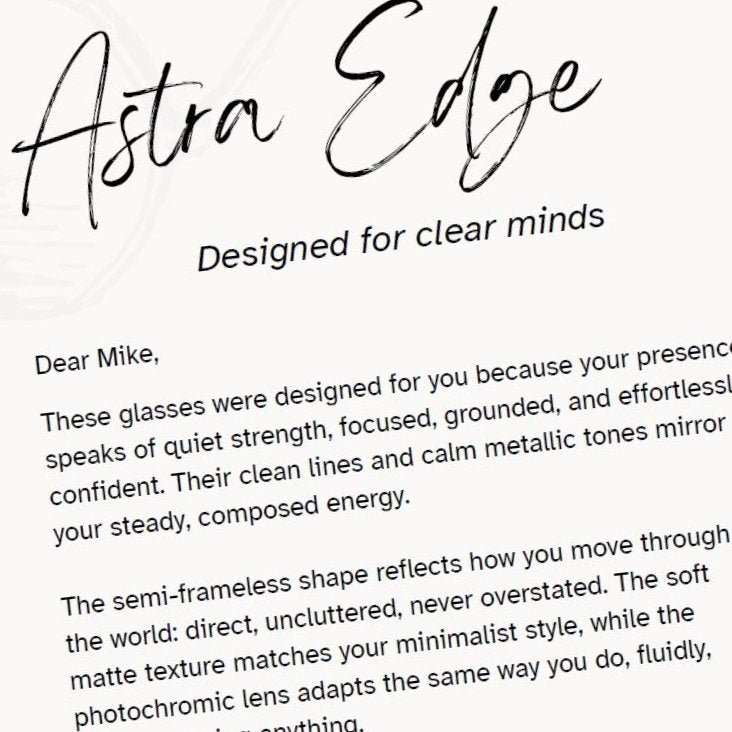 - Frame shape tailored to your facial structure, posture, and aura